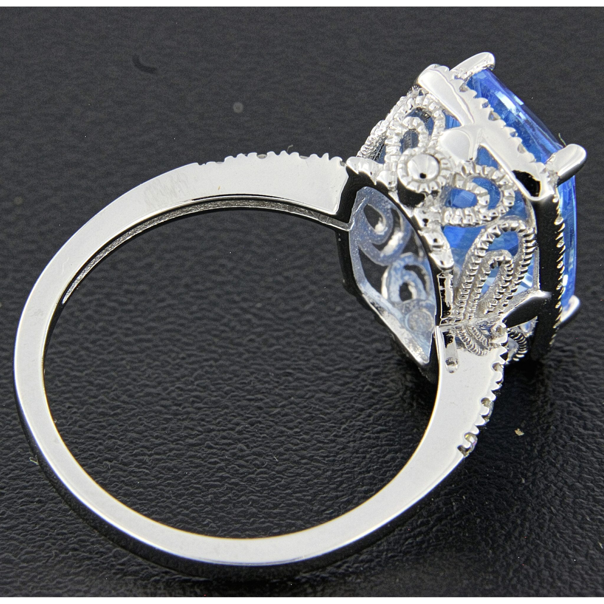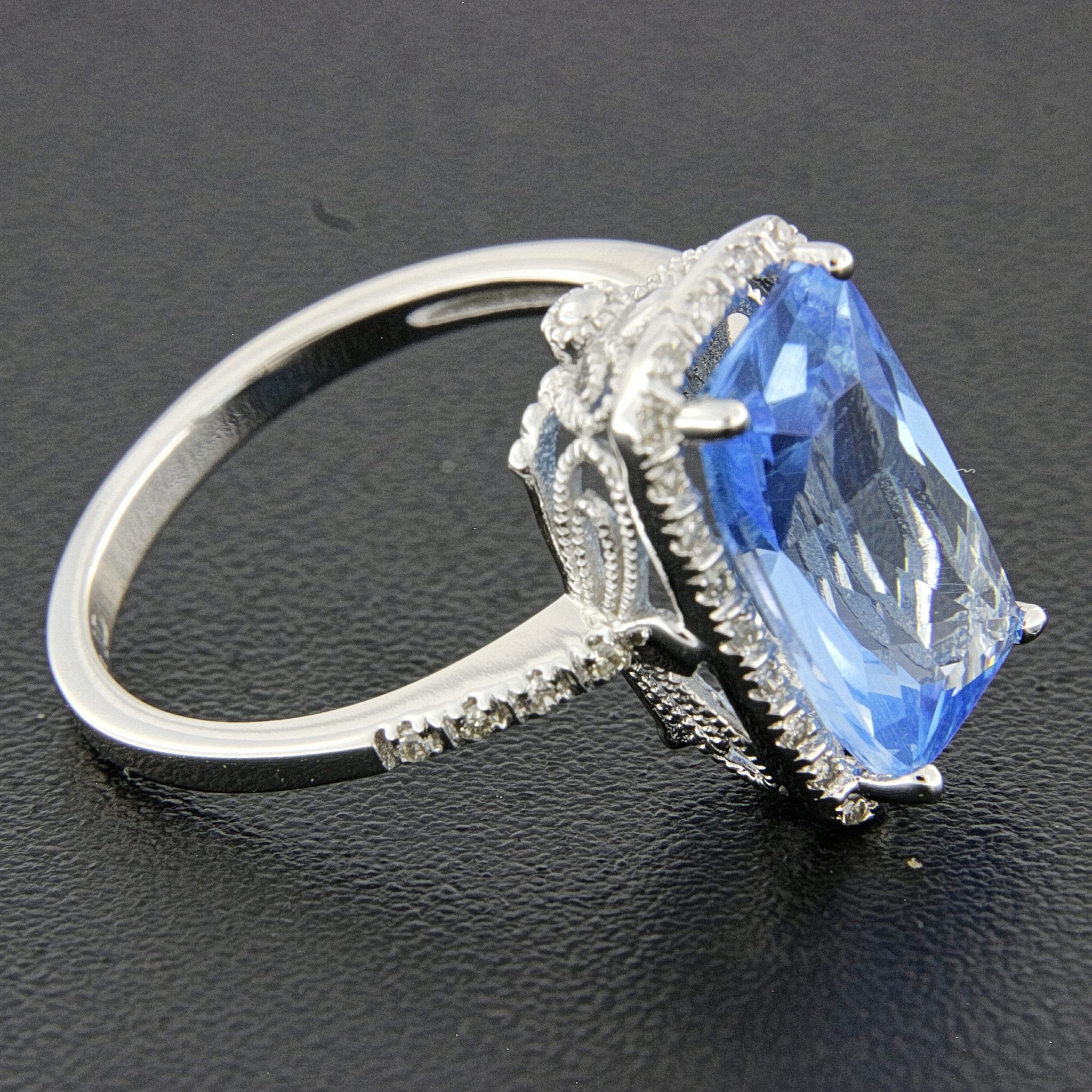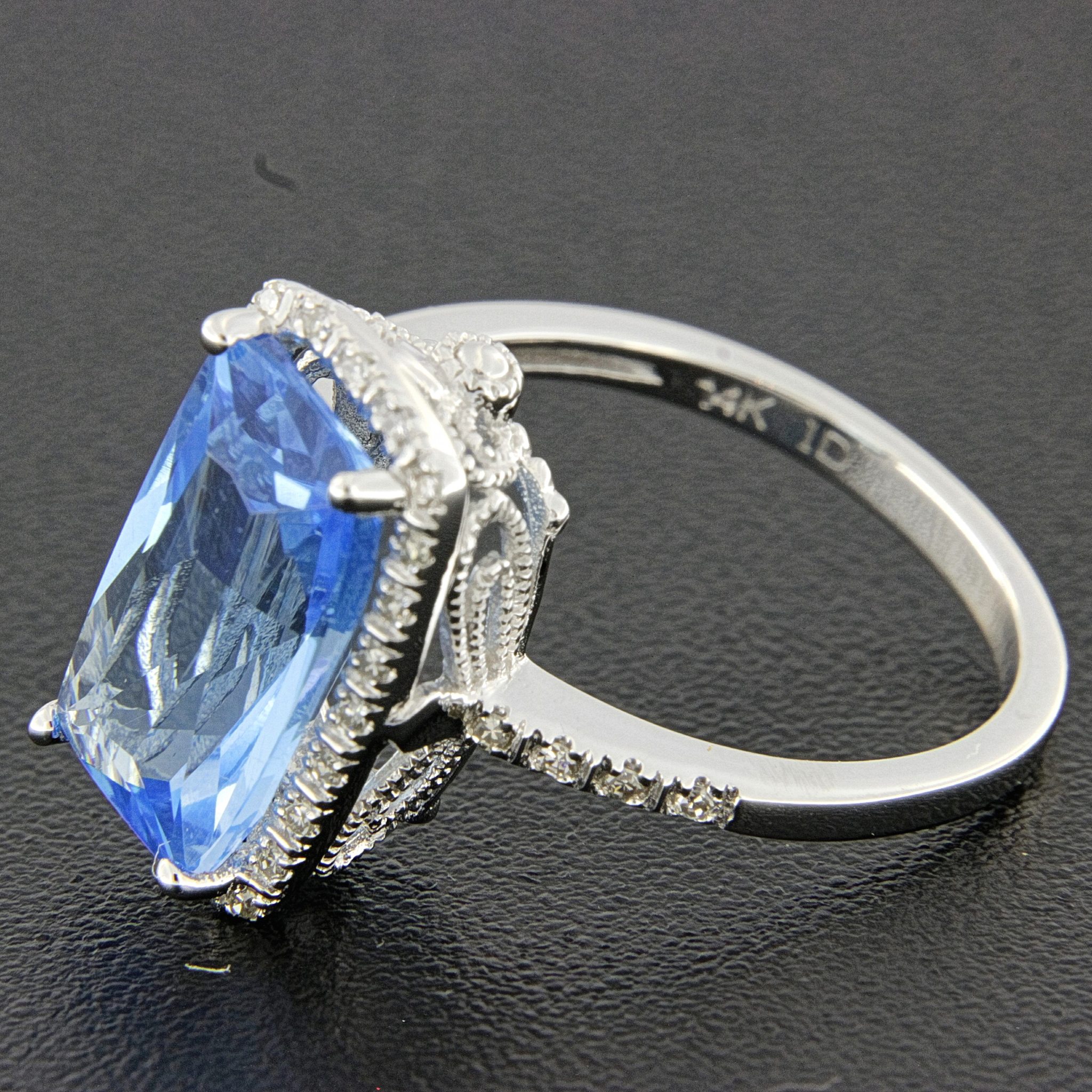 14k white gold ring size 7 with a 6.5 ct. cushion cut blue topaz and 0.14ct (tw) of pavé set diamonds surrounding the center stone.